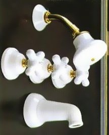 Modern ceramic quarter-turn valves for smooth drip-free operation. Porcelain spout shower head escutcheons and lettered cross handles. Also available as a tub only or shower only set (both with 8 Inches valve rough-in). P0453C.